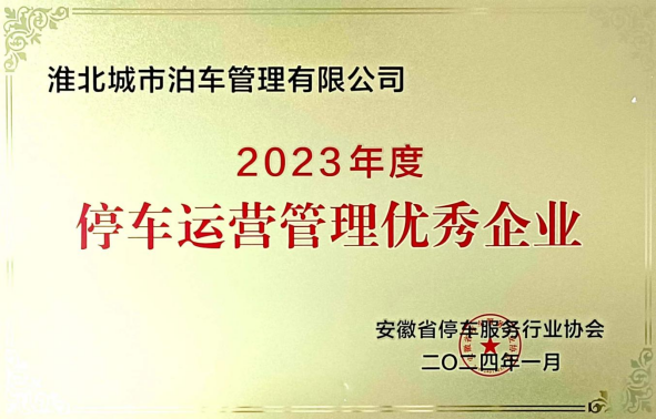 2024年1月,淮北城市泊車管理有限公司被安徽省停車服務(wù)行業(yè)協(xié)會(huì)授予2023年度“智能停車技術(shù)創(chuàng)新優(yōu)秀企業(yè)”、“停車運(yùn)營(yíng)管理優(yōu)秀企業(yè)”的殊榮。